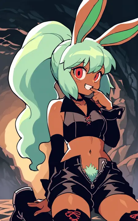 强化标签:红眼睛、动物耳朵、马尾辫、绿发、深色皮肤、兔耳、深肤色女性、兔女郎