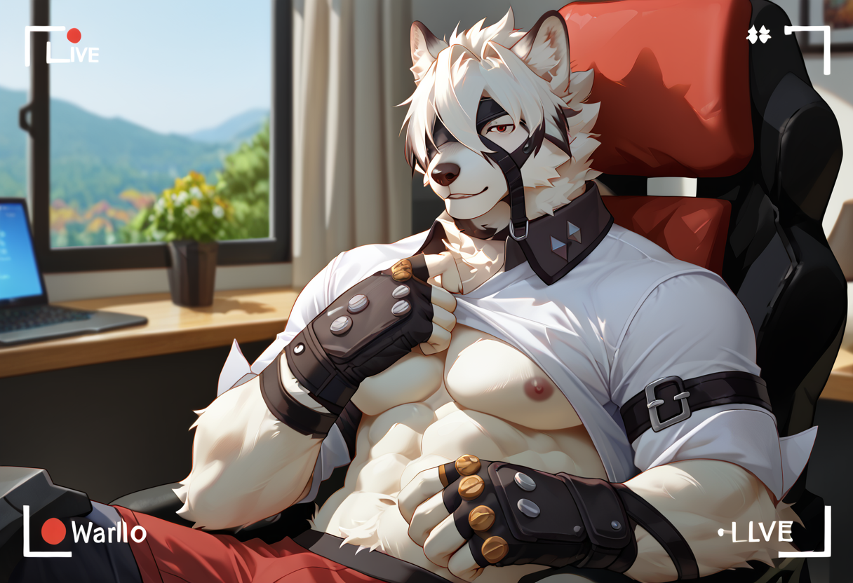 Illustrious: best quality, amazing quality, very aesthetic, absurdres, hires, von_lycaon, furry, furry male, 1boy, solo, white hair, bara, pectorals, wolf tail, red eyes, gloves, pants, ...your tags...