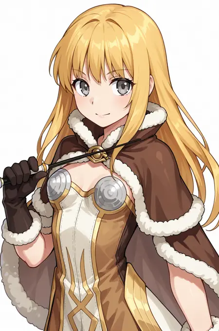 prompt: hiWizRO, fur trimmed, black gloves, brown dress, brown cape, two-tone dress, strapless dress, waist cape, knee boots
