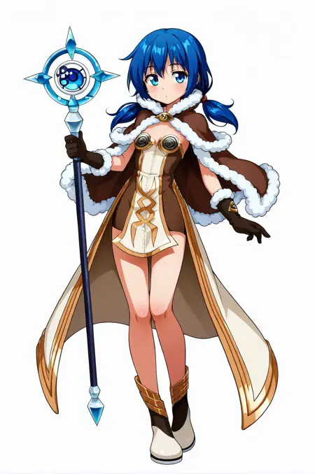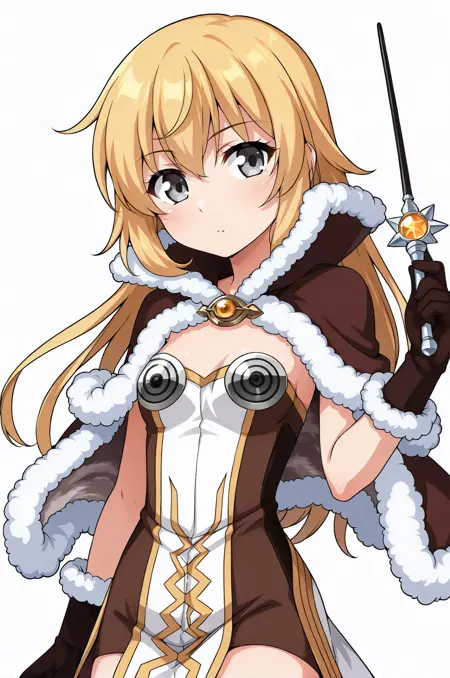 prompt: hiWizRO, strapless dress, two-tone dress, sleeveless dress, brown dress, fur-trimmed cape, fur-trimmed gloves, white waist cape, jewelry, boots