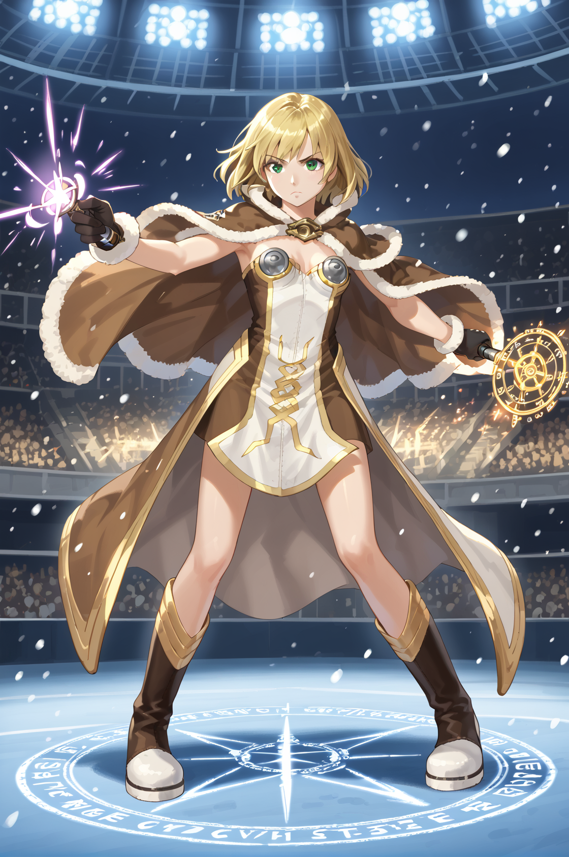 prompt: hiWizRO, 无肩带连衣裙, 双色连衣裙, 无袖连衣裙, 棕色连衣裙, 毛皮镶边斗篷, 眼睛图案毛皮镶边手套, 白色腰部斗篷, 靴子
