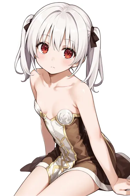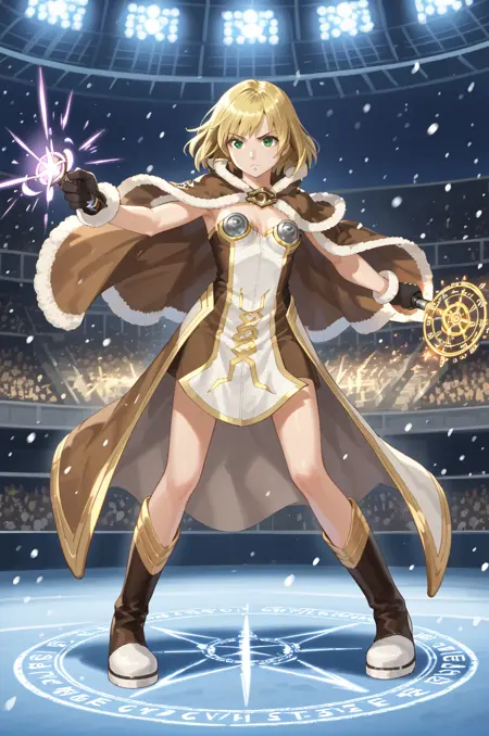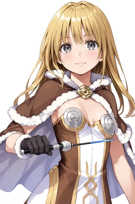 prompt: hiWizRO, 无肩带连衣裙, 双色连衣裙, 无袖连衣裙, 棕色连衣裙, 毛皮镶边斗篷, 毛皮镶边手套, 白色腰部斗篷, 饰品, 靴子