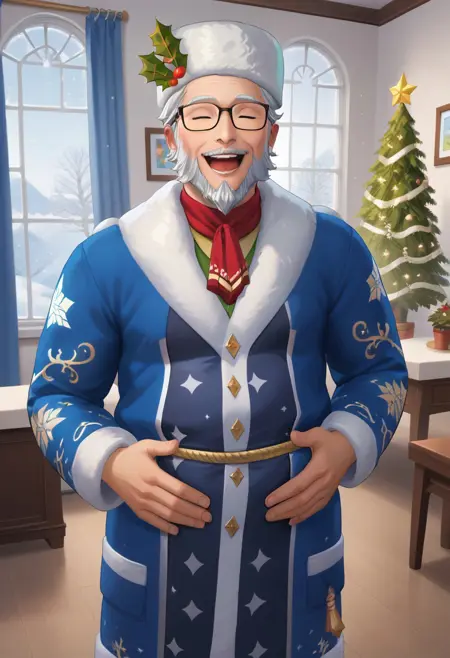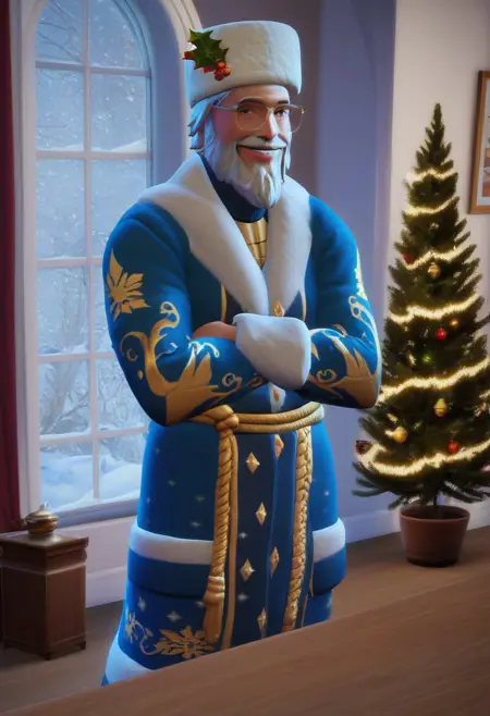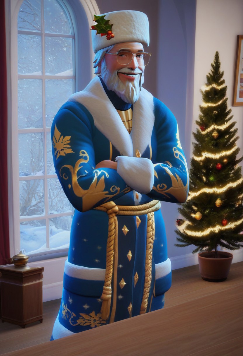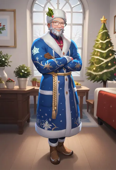 1man , solo , old man , Glasses , White beard , smiling , winter clothes , fur hat , blue clothes ,