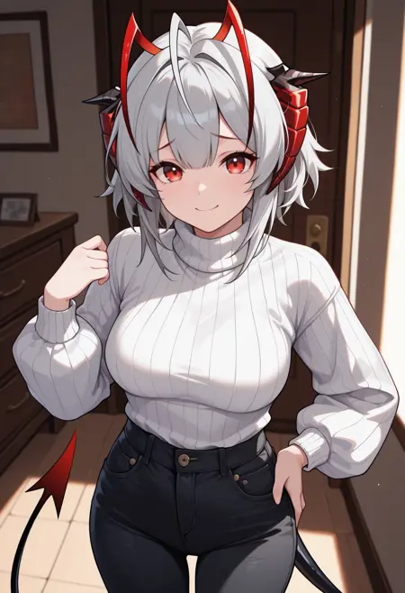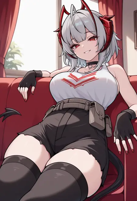 Default Outfit: wdef, demon tail, short hair, grey hair, ahoge, antenna hair, red horns, demon horns, antennae, red eyes, black jacket, open jacket, sleeves past elbows, grey shirt, black gloves, fingerless gloves, layered skirt, black skirt, red skirt, miniskirt, black pantyhose, black scarf, red nails