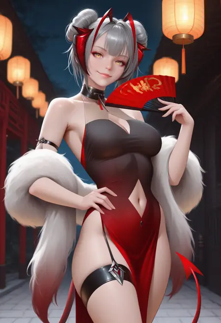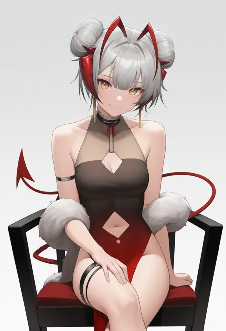 中国风礼服: wcnds, 魔鬼尾巴, 短发, 灰发, 天线状头发, 双发髻, 红色角, 魔鬼角, 天线, 黄眼, 渐变礼服, 黑色礼服, 红色礼服, 中国风礼服, 无袖礼服, 胸部开洞, 肚脐开洞, 肩带, 披肩, 羽毛围巾, 骨盆帘, 大腿带, 裸肩