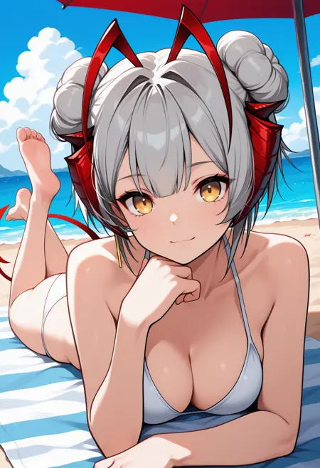 夏季: wsmmr, 魔鬼尾巴, 短发, 灰发, 天线发, 天线状头发, 红色角, 魔鬼角, 天线, 红眼, 透明衬衫, 不对称袖子, 红色比基尼, 印花比基尼, 黑色项圈, 红色指甲, 胸部露出