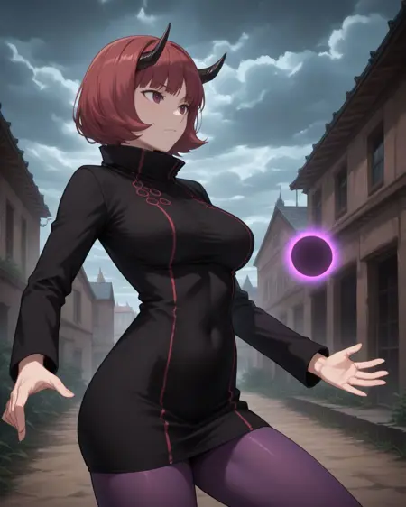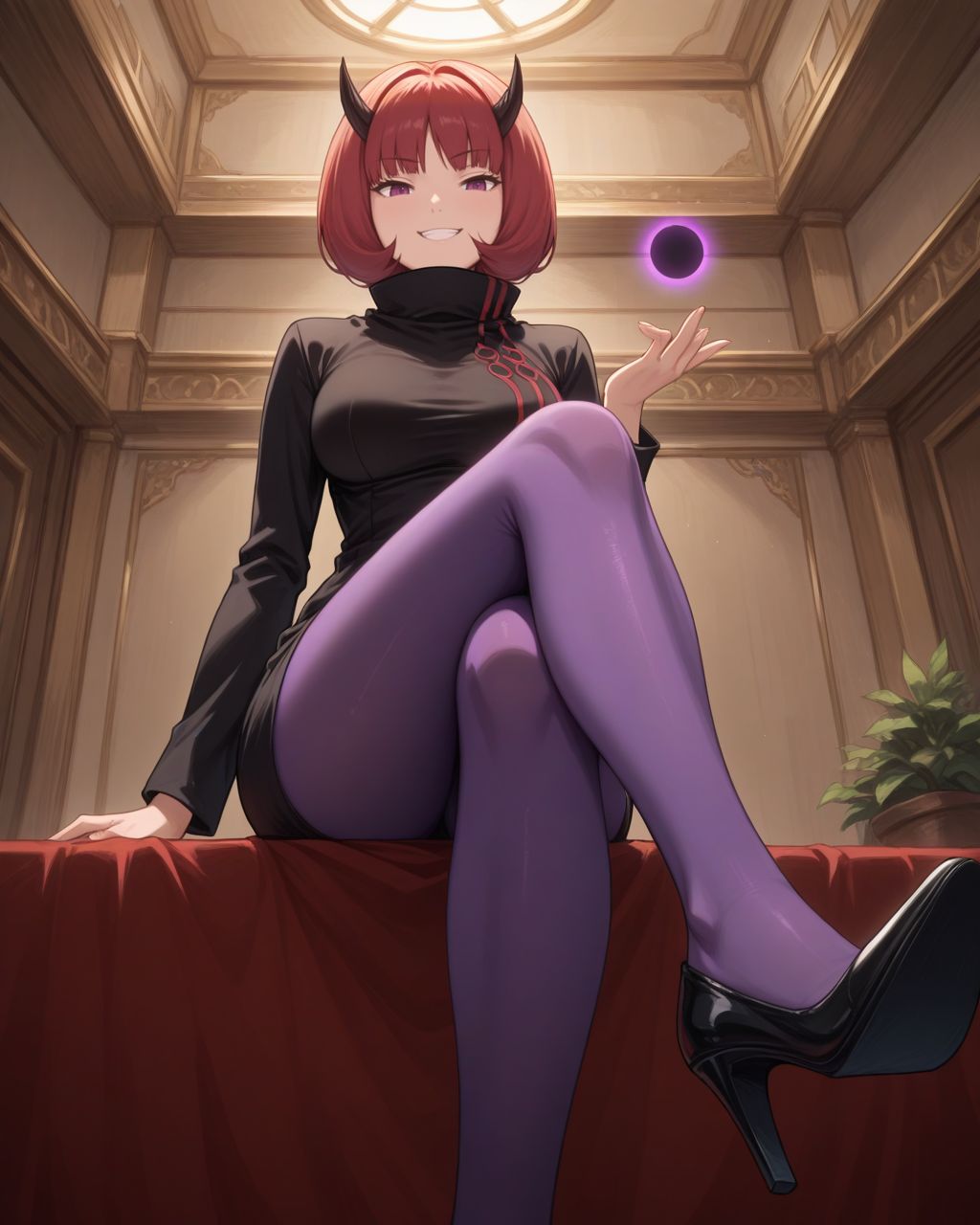 基本衣装: 黒いドレス、長袖、紫のパンティストッキング、ハイヒール、