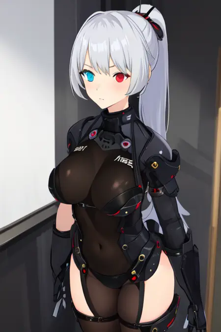 kuninotokotachi, (heterochromia, red eye, blue eye), ponytail, large breasts, grey hair