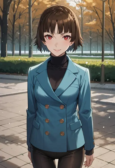 p5makoto-wintercas, black turtleneck, blue jacket, double-breasted jacket, gold buttons, black pants, pantyhose, knee boots, brown boots,