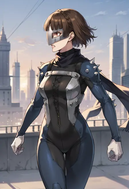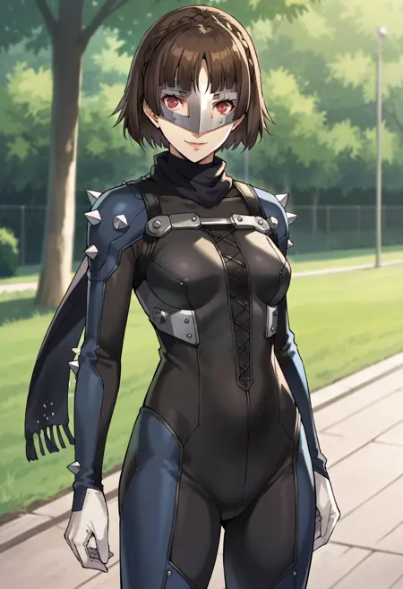 p5makoto-queen, 바디수트, 검정 바디수트, 남색 바디수트, 스파이크, 어깨 스파이크, 흰 장갑, 스카프, 검정 스카프, 마스크, 바이커 복장, 마스크,