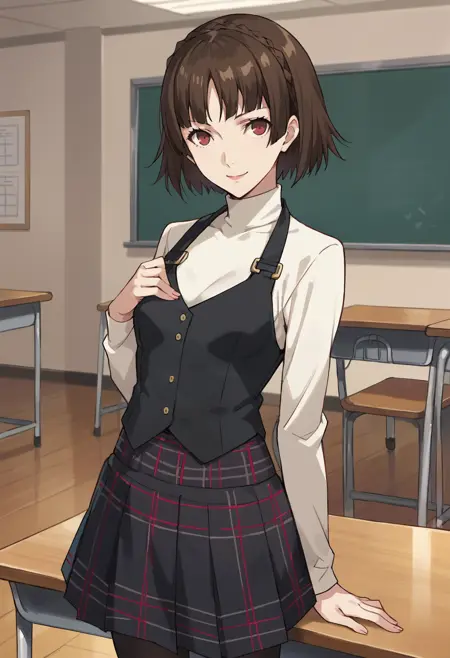 p5makoto, niijima makoto, 棕色头发,齐刘海,皇冠辫子,红眼睛,