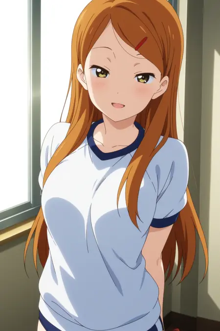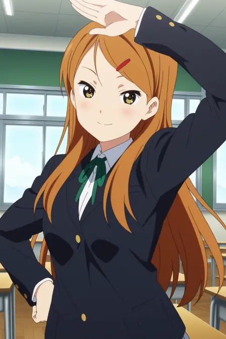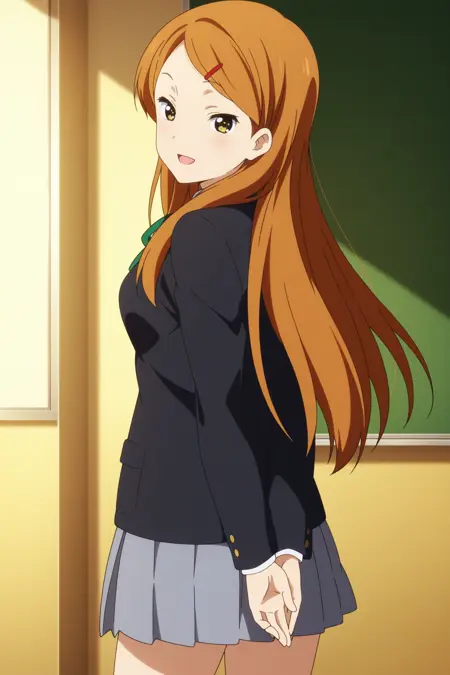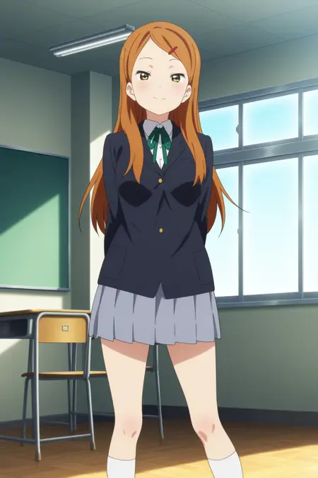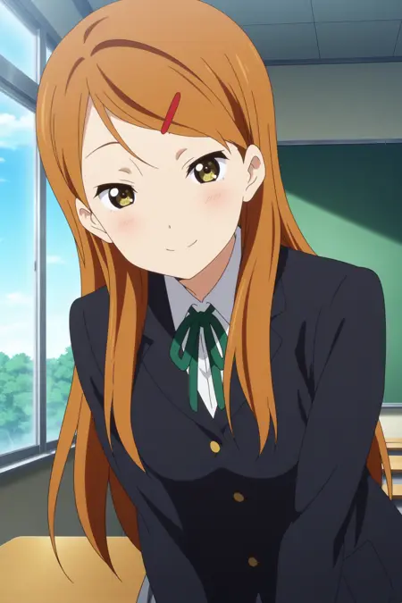 sokabe megumi, long hair, orange hair, red hairclip, yellow eyes, school uniform, black jacket, white shirt, collared shirt, green ribbon, grey skirt, pleated skirt, white kneehighs, loafers