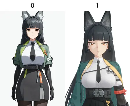 プロンプト: zenless zone zero, zenless zone zero, zenless_zone_zero_hoshimi_miyabi, znlssznzrhshmmyb, 1girl, black hair, brown eyes, large breasts, fox ears, animal ears, bangs, black skirt, blunt bangs, gloves, long hair, pantyhose, shirt, medium skirt, necktie, black necktie, open jacket, jacket, white shirt, green jacket, black fox ears, black pantyhose, elbow gloves, breasts, collared shirt