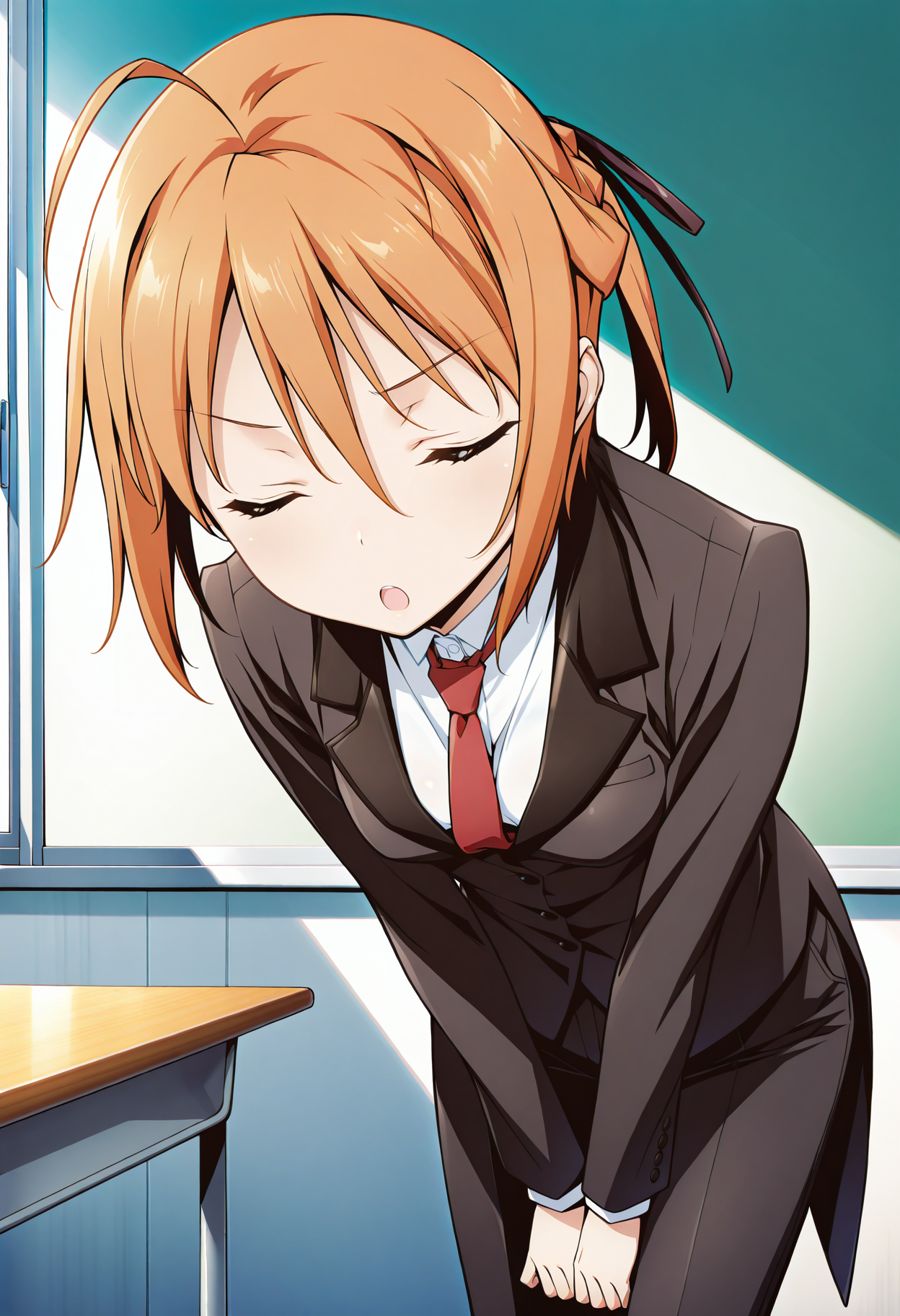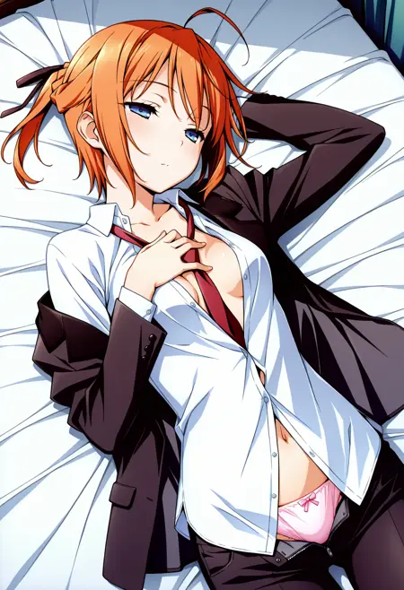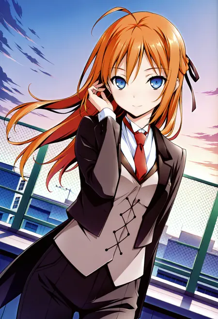 베이스: ksubaru, 1girl, solo, short hair, short ponytail, hair ribbon, orange hair, ahoge, blazer, red necktie, dress shirt, vest, formal suit, pants, long sleeves, small breasts,