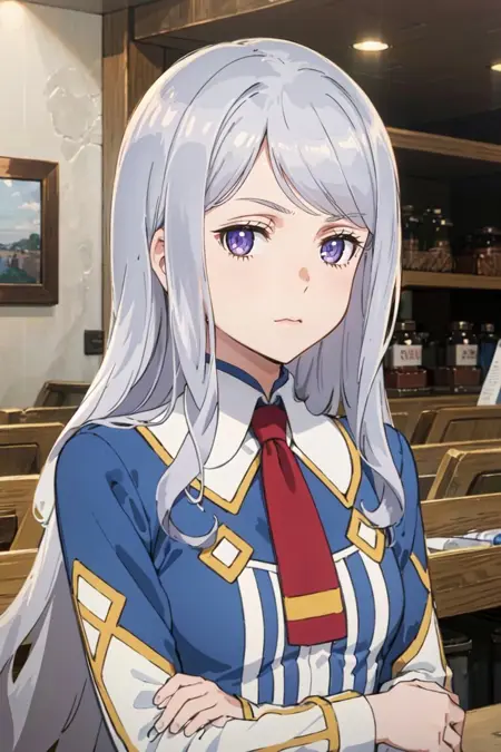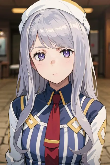기본 시작 시 다음 태그를 사용하세요: pikkyairmid, 1girl, solo, looking at viewer, grey hair, long hair, bangs, purple eyes, hat, headwear, thigh boots, boots, thighhighs, gloves, elbow gloves