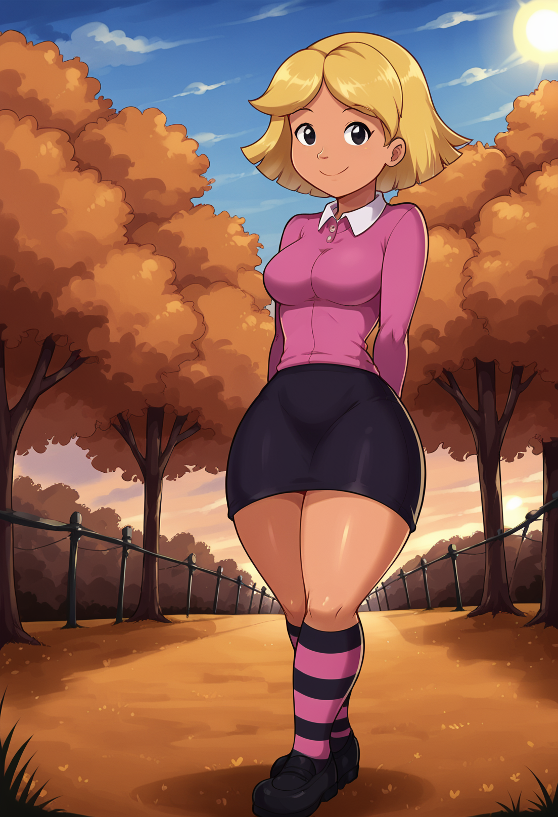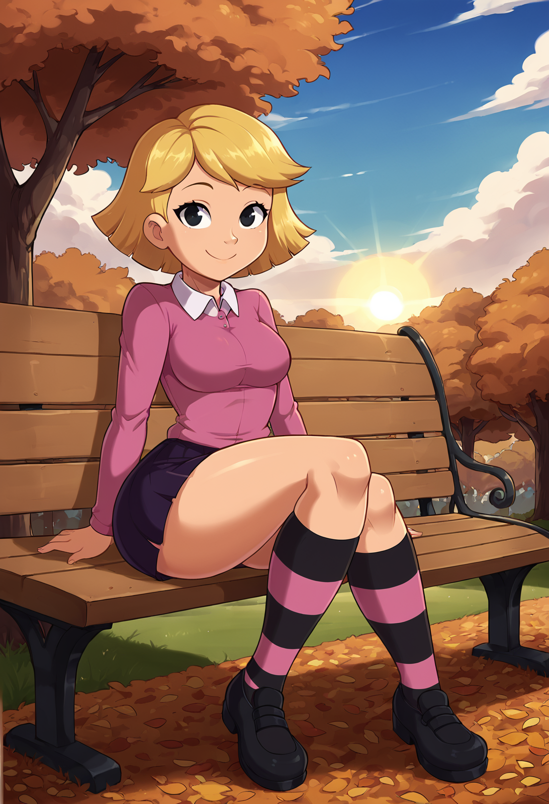 トリガーワード:1girl, solo, ブロンドヘア, 短髪, ピンクのシャツ, コラー, 濃い紫のスカート, 膝下ソックス, 縞模様の靴下, 黒い靴