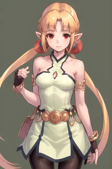 AlfinaGrandia, 1girl, solo, very long hair, blonde hair, hair ornament, red eyes, fingerless gloves, green dress, bare shoulders, twintails, jewelry, medium breasts, pantyhose, pointy ears, belt, bracelet, halterneck, elf,
