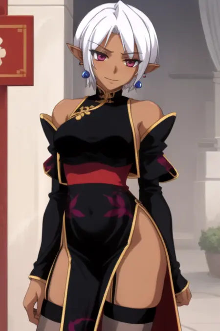 SaraHandM4id, 1girl, solo, short hair, thighhighs, black dress, bare shoulders, jewelry, white hair, earrings, detached sleeves, pointy ears, dark skin, dark-skinned female, garter straps, dark elf, china dress, side slit