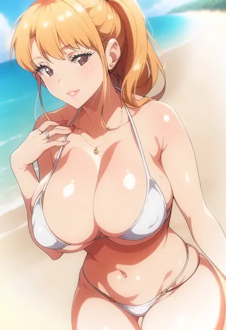 Character: Aika: 1girl,aika,brown eyes,blonde hair,long hair,jewelry,earrings,stud earrings,ring,wedding ring,ponytail,bangs,breasts,large breasts