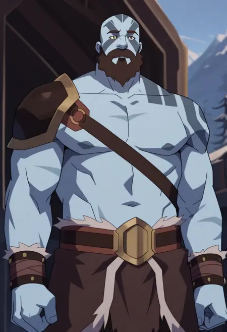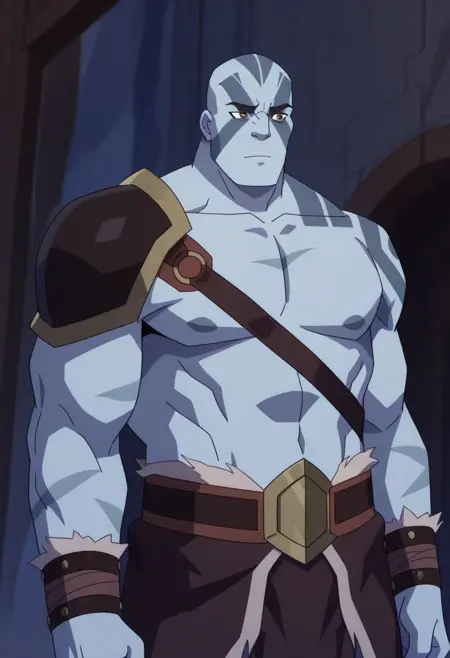 grogstron, 1boy, 남성 초점, 싱글, 색상이 있는 피부, 파란 피부, 갈색 눈, 대머리, 근육질, 가슴근, 드러난 가슴근, 큰 가슴근, 복근, 문신, 머리 문신, 어깨 갑옷, 어깨판, 단일 어깨판, 뒷치마, 바지, 갈색 바지, 신발,