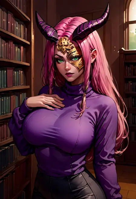 black dress, cleavage, long sleeves, purple thighhighs, lipstick,