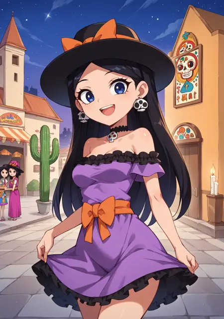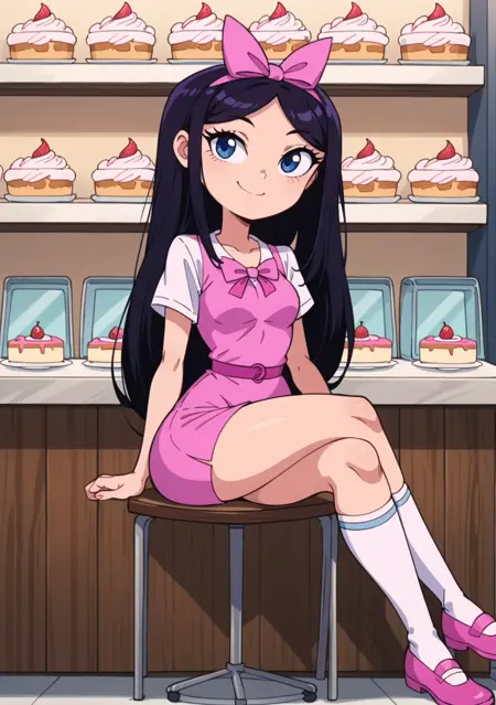 トリガーワード: 1girl, solo, 黒髪, 青い目, 白いアンダーシャツ, ピンクのドレス, 紫の胸ポケット, 白い靴下, 膝下靴下, ピンクの履物