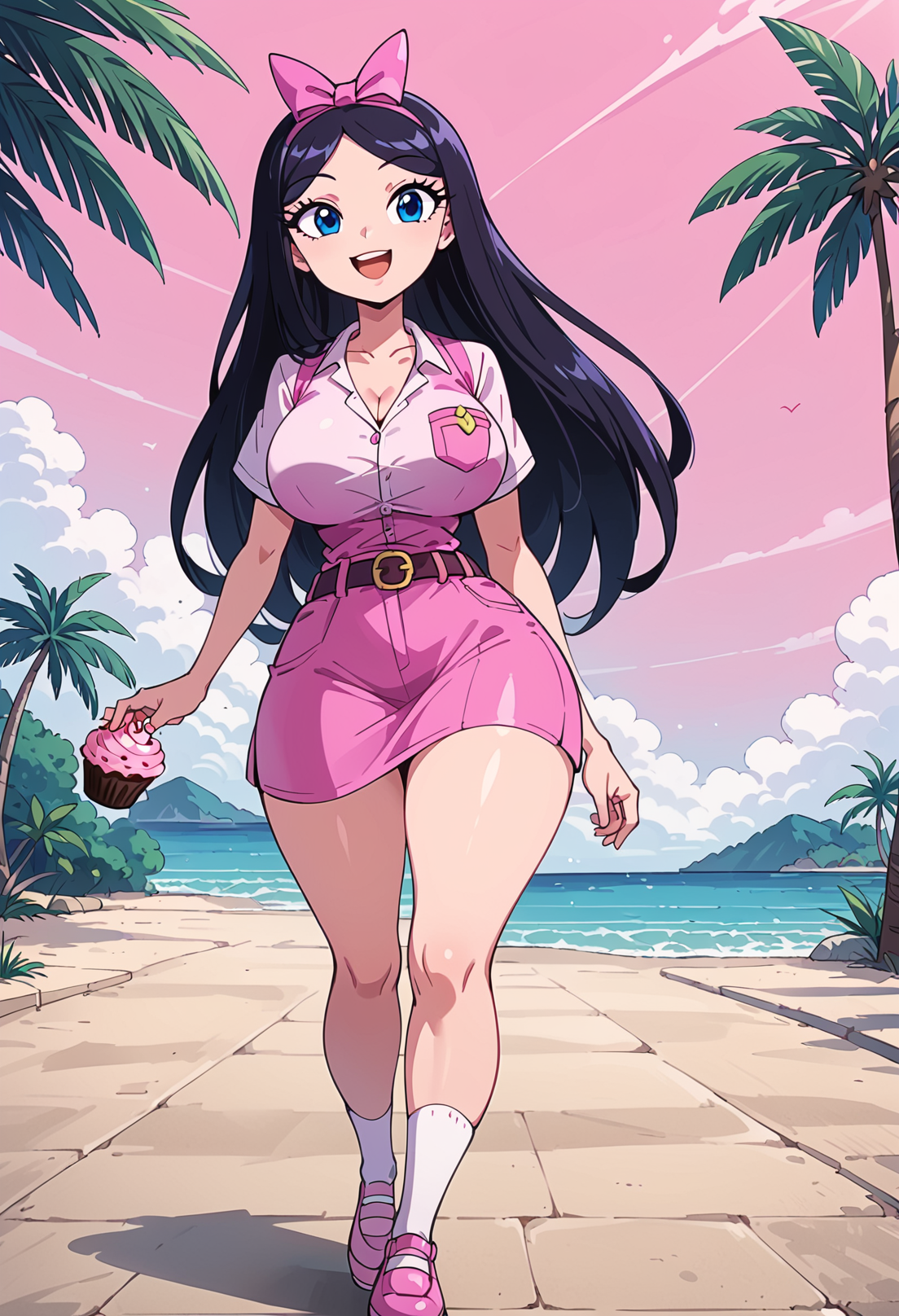 트리거 단어: 1girl, solo, 검은 머리, 파란 눈, 흰색 언더셔츠, 분홍색 드레스, 보라색 가슴 주머니, 흰색 양말, 무릎 양말, 분홍색 신발