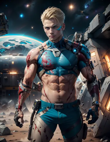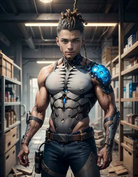 トリガー語は「biosoldier」。強度は0.8–0.9を使用し、肩のアーマーではなく赤い筋繊維を描き出すために「exposed shoulders」とも提示してください。CFGは7–9が最適です。