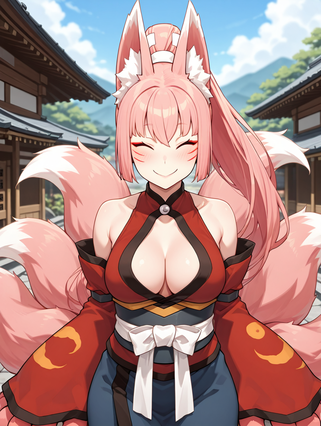 야오, 분홍색 머리, 긴 머리, 팔찌 머리, 키테인, 빨간 눈, 얼굴 무늬, 여우 귀, (여우 꼬리), (빨간 눈썹선), 몬스터 걸, 수직 동공, 여러 개의 꼬리, 동물 발, 파란 키모노, 빨간 셔츠, 가슴 노출, 분리된 소매, 띠,