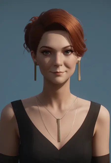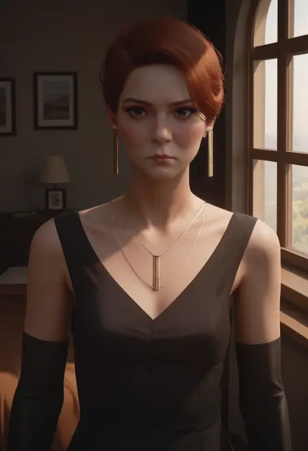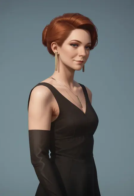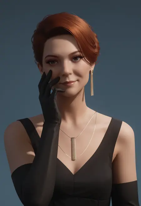 dianaf, 1girl, red hair, hair bun, single hair bun, breasts, jewelry, earrings, necklace, elbow gloves, black dress, dress, high heels