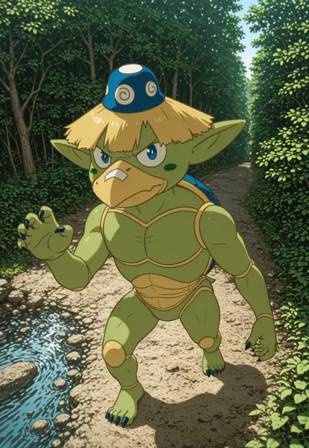Illuminousタグ: kapprentice、ソロ、帽子、男性焦点、1boy、全身、青い目、緑色の肌、尖った耳、色付きの肌、カッパ、関節、爪、くちばし、鼻テープ、頬チークステッカー、金髪、水かきのある手、水かきのある足、亀の甲羅、短い尾