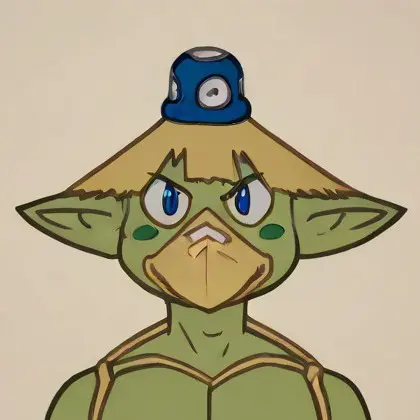 kapprentice. 이 이미지는 판타지적인 인체형 생물의 디지털 드로잉으로, 동물과 인간의 특징이 혼합된 느낌을 준다. 이 생물은 직립 자세로 서 있으며, 매끄럽고 연한 녹색 피부로 덮인 근육질의 인체형 몸체를 지녔다. 그의 체형은 운동선수처럼 단단하며, 가슴, 복부, 팔, 다리에 선명한 근육이 드러나 있다. 이 생물은 새처럼 생긴 부리와 녹색 혀, 큰 날카로운 귀, 강렬하고 약간 장난스러운 표정을 지닌 큰 푸른 눈을 지니고 있다. 머리에는 하늘색과 흰색 무늬가 있는 둥근 엠블럼이 달린 넓은 모자 모양의 짚모자를 쓰고 있으며, 이 모자는 생물의 진지한 분위기에 유쾌한 느낌을 더한다. 손과 발은 발가락과 손가락 사이에 막이 있으며, 끝은 푸른색으로 칠해진 날카로운 갈고리 발톱을 지니고 있다. 생물의 피부에는 노란색 관절 부분이 장식되어 있어 외관에 질감과 세부 묘사가 더해졌다. 배경은 단순한 흰색으로, 생물의 존재를 더욱 뚜렷하게 부각시킨다. 전체적인 화풍은 디지털 아트에서 흔한 두꺼운 윤곽선과 평평한 색상으로 이루어진 만화 스타일이다. 몸의 자세는 역동적이며, 한 손은 얼굴 쪽으로 들려 닫혀 있고, 다른 손은 허리에 얹으며 두 다리는 펴고 있어 움직임이나 행동을 연상시키는 포즈를 취하고 있다.