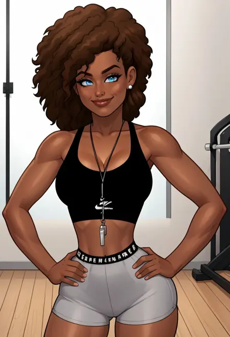 dark skin, ebony, ebony female, dark-skinned female, midriff, brown hair, big hair, afro, freckles, blue eyes, pearl earrings, black sports bra, cleavage, grey shorts, tight shorts, whistle necklace, sleeveless, bare arms, bare shoulders,