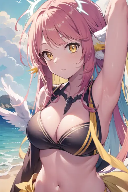 jibril, angel, angel wings, animal ears, bird ears, compass rose halo, feathered wings, feathers, gradient hair, halo, long hair, low wings, multicolored hair, navel, pink hair, symbol-shaped pupils, tattoo, white wings, wing ears, wings, (yellow eyes:1.5)