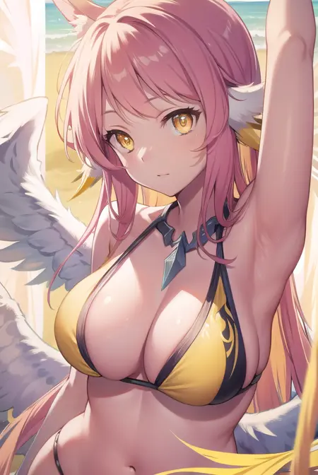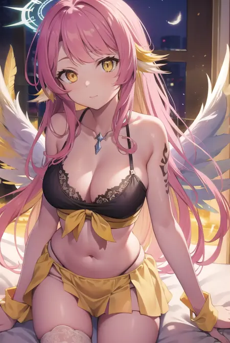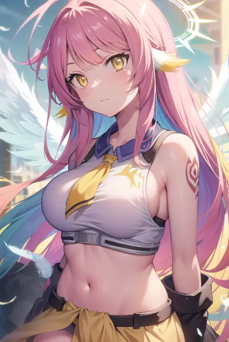jibril, angel, angel wings, animal ears, bird ears, compass rose halo, feathered wings, feathers, gradient hair, halo, long hair, low wings, multicolored hair, navel, pink hair, symbol-shaped pupils, tattoo, white wings, wing ears, wings, (yellow eyes:1.5)
