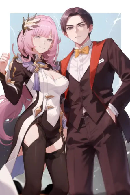AceElysia, a man and a woman, hetero, standing, smile, cowboy shot
