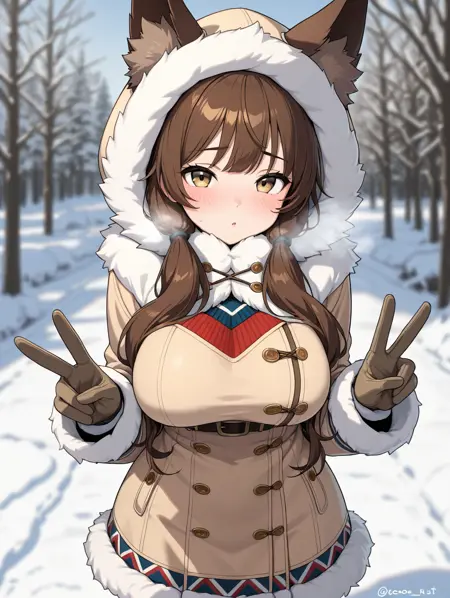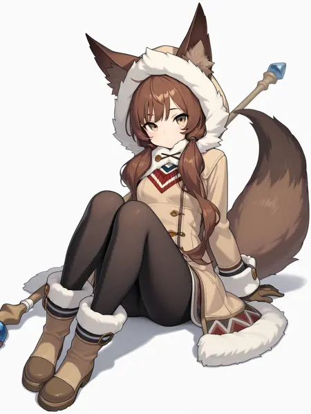 coco, 1girl, solo, 긴 머리, 갈색 머리, 장갑, 동물 귀, 더블 테일, 갈색 눈, 꼬리, 풀 바디, 노랑눈, 팬티스타킹, 부츠, 후드, 코트, 검은 팬티스타킹, 모직 테두리, 낮은 더블 테일, 갈색 장갑,