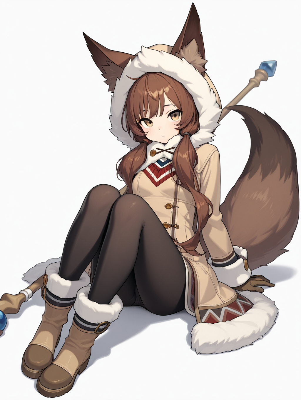 coco, 1girl, solo, long hair, brown hair, gloves, animal ears, twintails, brown eyes, tail, full body, yellow eyes, pantyhose, boots, hood, coat, black pantyhose, fur trim, low twintails, brown gloves,