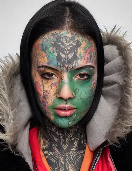 바디아트와 문신의 세부 요소를 세밀하게 조정하여 얼굴 전체에 페인팅하고, 복잡한 디자인과 추상적인 형태 및 선을 가진 문신 같은 바디아트를 구현할 수 있으며, 사람에게 적용하거나 물체에 패턴을 입히는 데 사용할 수 있습니다.