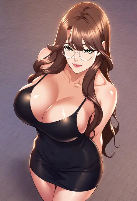 Ballet Professor: ballet_professor_dance_department, piercing green eyes, beautiful brown hair, beautiful long hair, bangs, huge and shaggy breasts, (big round glasses, )