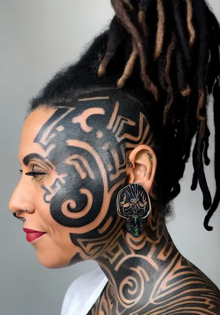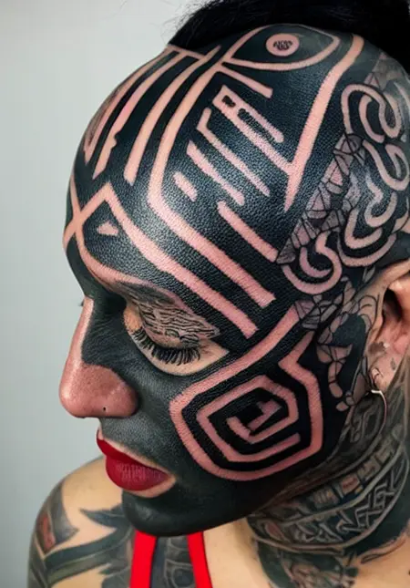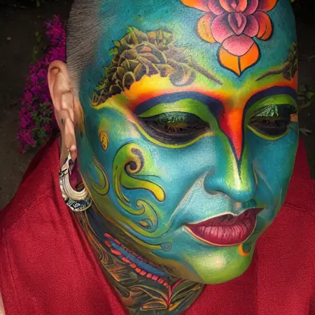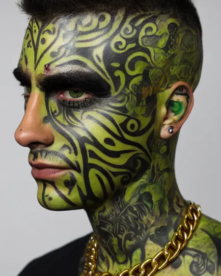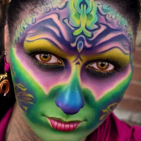 fine tunes the aspects of bodyart and tattoos to feature full face painting and tattoo like body art with ornate designs and abstract shapes and lines, can be used on persons or to apply patters to objects.