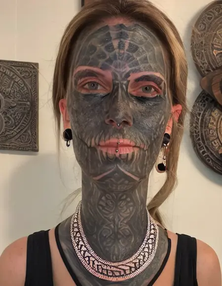 바디아트와 문신의 세부 요소를 세밀하게 조정하여 얼굴 전체에 페인팅하고, 복잡한 디자인과 추상적인 형태 및 선을 가진 문신 같은 바디아트를 구현할 수 있으며, 사람에게 적용하거나 물체에 패턴을 입히는 데 사용할 수 있습니다.