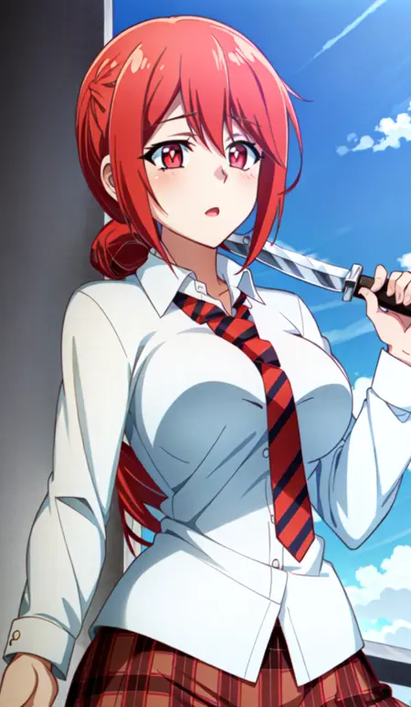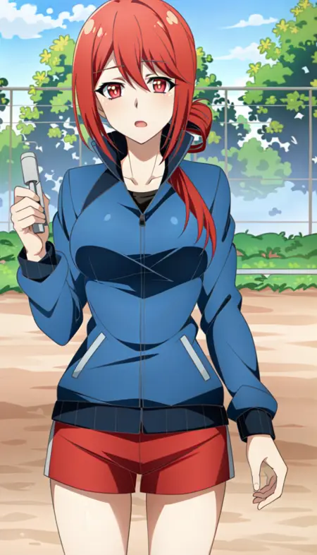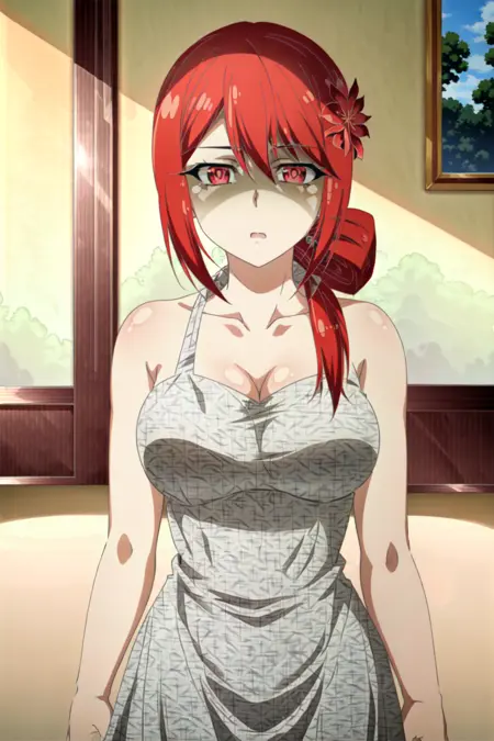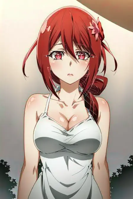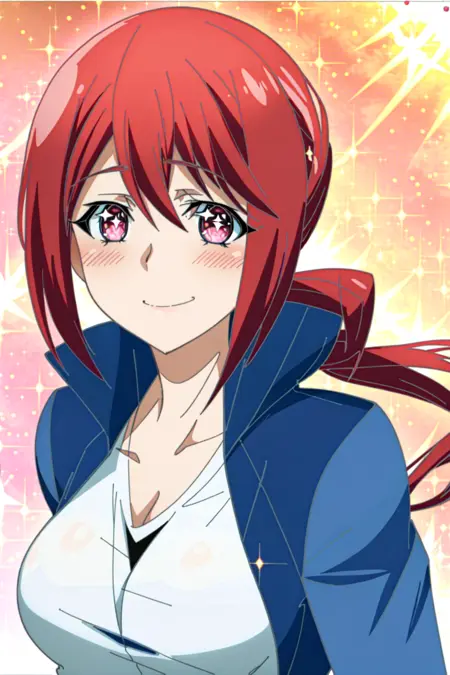 Akane Hiyama, 1girl, red hair, solo, red eyes, smile, long hair, hair ornament