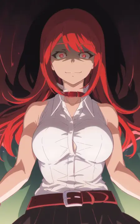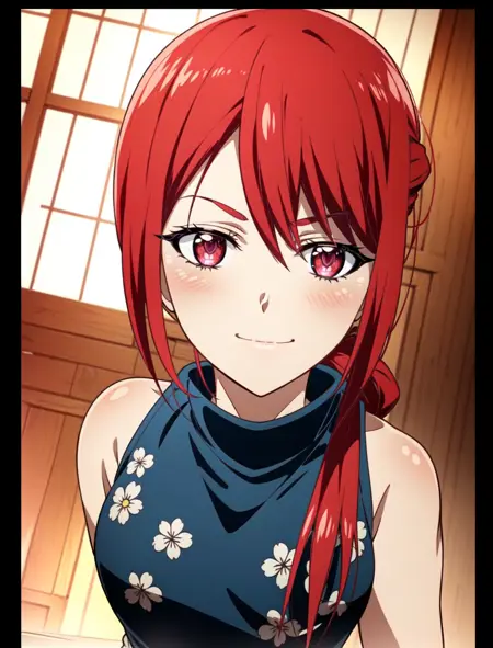 Akane Hiyama, 1girl, 红发, 单人, 红眼, 微笑, 长发, 发饰