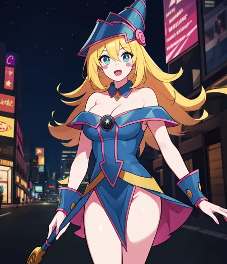 • 推荐提示词:dark_magician, 1girl, solo, long hair, hair between eyes, blue eyes, green eyes, blonde hair, large breasts, big breasts, hat, (dress), cleavage, blue dress, bare shoulders, boots, ((blush stickers)), ((blue headwear)), (blue footwear), wand, duel monster, (pointy wizard hat), (wizard hat), ((long legs)), two legs, ((thighs))