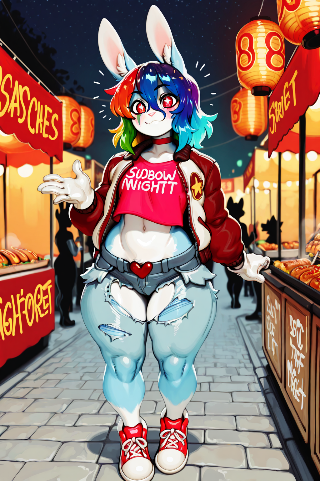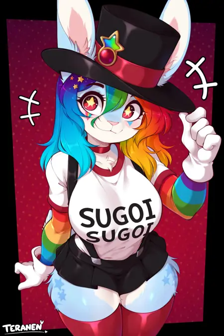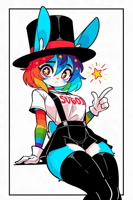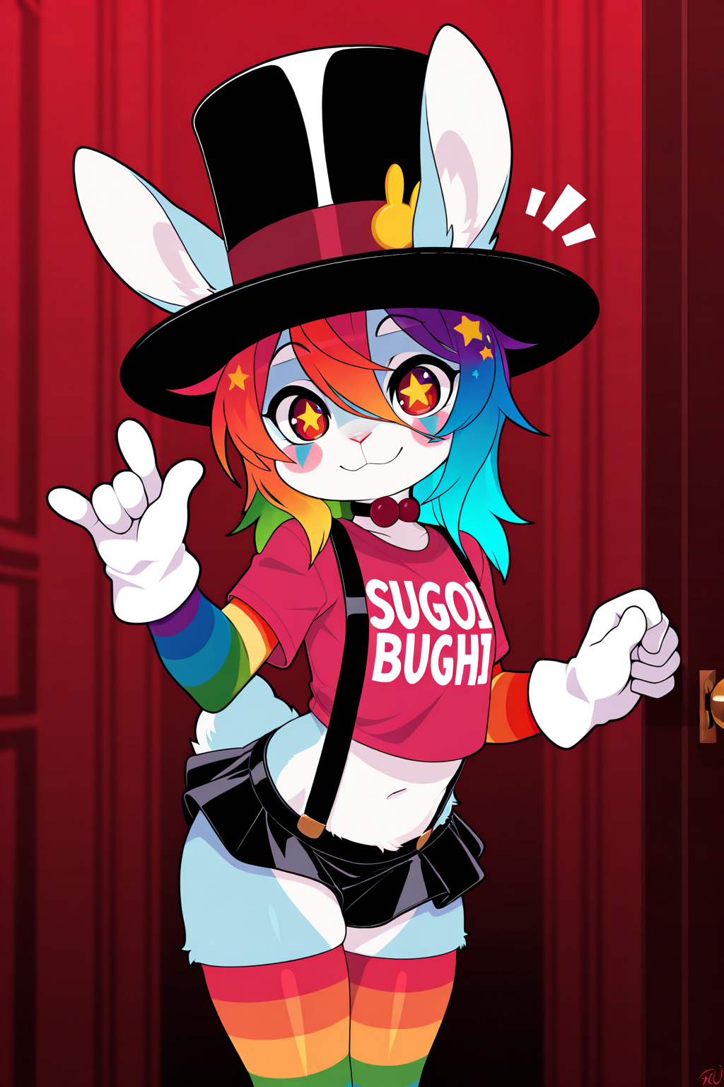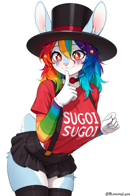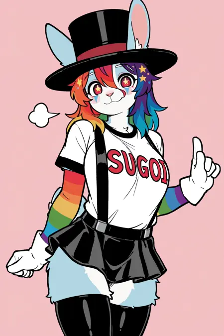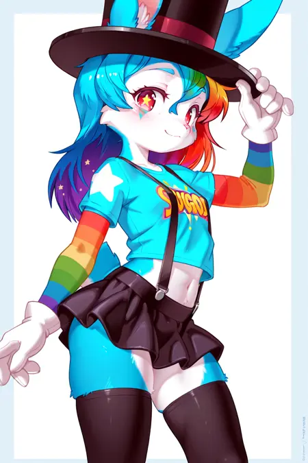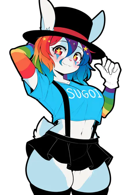 トリガー:YCcake、ラゴモルフ、ウサギ、アンスロ、星形の瞳、赤い目、レインボーヘア、多色髪、クラウンメイク、パステルブルーの毛、白い毛、マジシャン帽、レインボーアームウォーマー、白い手袋、サスペンダー、ミニスカート、太ももハイ
