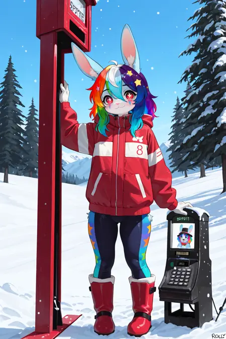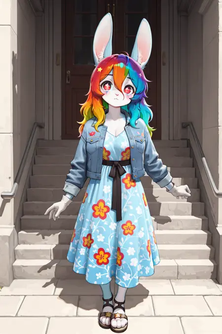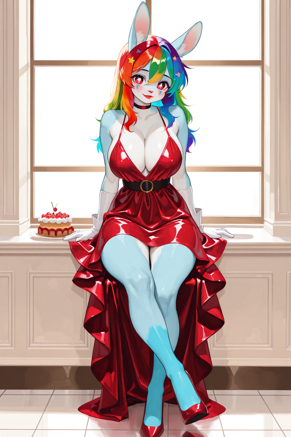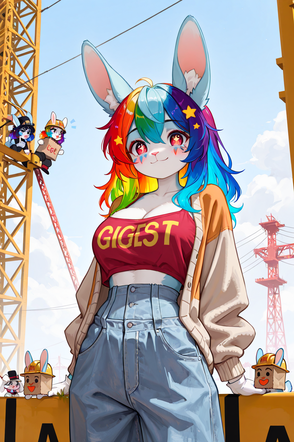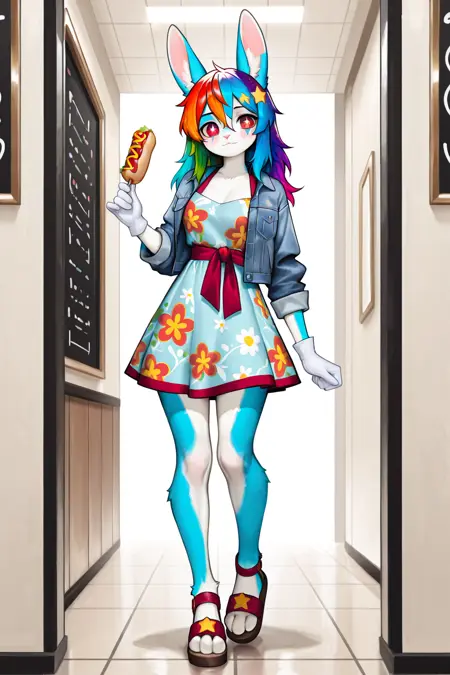 トリガー:YCcake、ラゴモルフ、ウサギ、アンスロ、星形の瞳、赤い目、レインボーヘア、多色髪、クラウンメイク、パステルブルーの毛、白い毛、マジシャン帽、レインボーアームウォーマー、白い手袋、サスペンダー、ミニスカート、太ももハイ