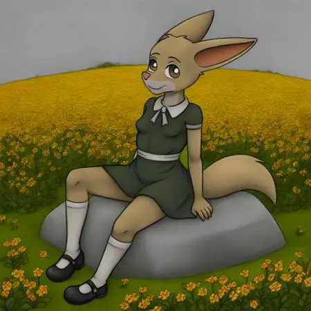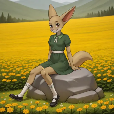 foxgirl, Fennec fox, tan fur, brown eyes, large ears, fox tail, pink nose, small breasts,