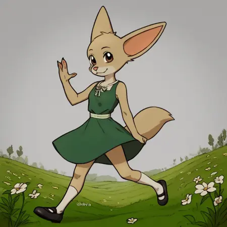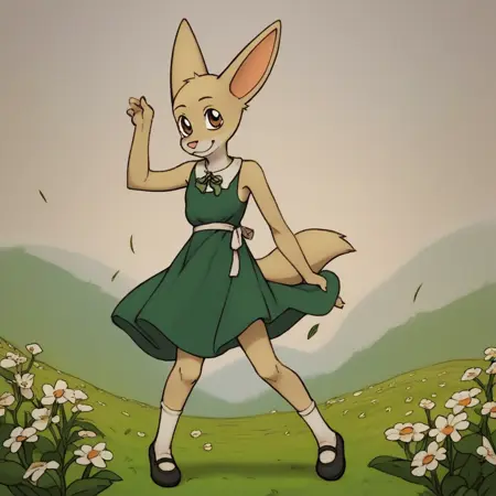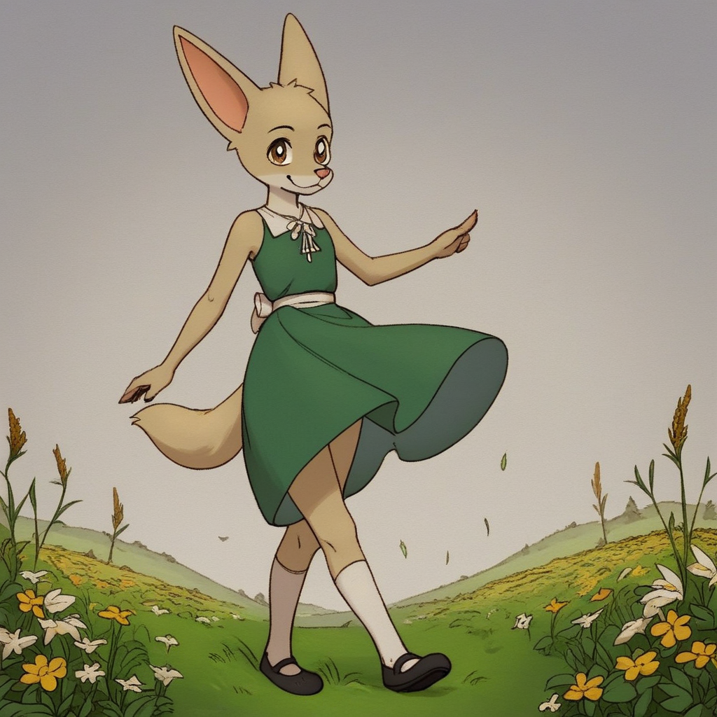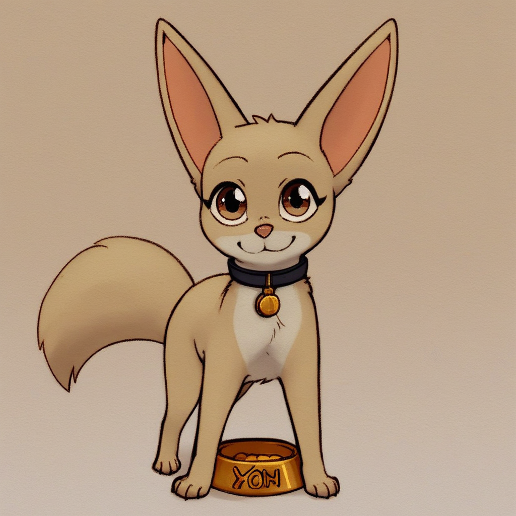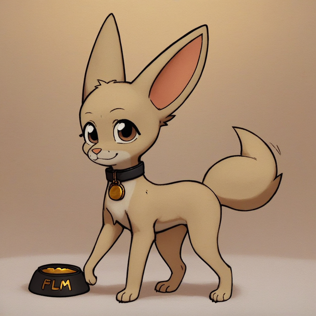 Foxgirl, Fennec fox, tan and white fur, fluffy tail, large ears, pink nose, slim figure, brown eyes,