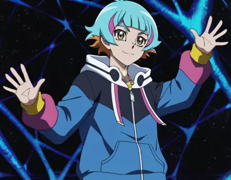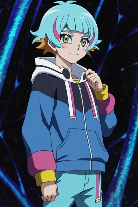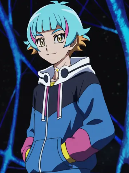提示:男性,五彩头发,三色头发,挑染头发,蓝色头发,粉红色发梢,橙色发梢,黄色眼睛,黄色颈部钻石,连帽衫,长袖,浅蓝色裤子,粉红色鞋子,腕表(用于决斗盘),王座厅,赛博空间(用于LINK VRAINS),Electrilyrical World